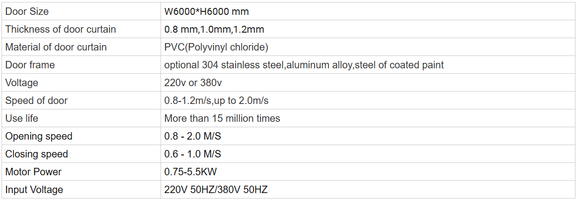 High speed opening and close and super seal will keepaving . the indoor energy or cold air ,save the energy cost for the owner.Widely used for where there is temperature difference area.