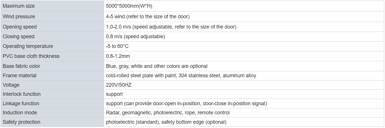 High speed door parameters